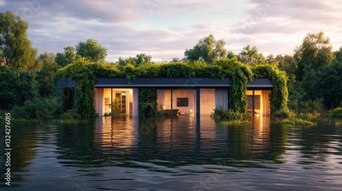 Flooded house surrounded by water with interior rooms full of water in a detailed and distressed state