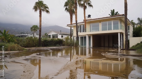 Flooded Property in Residential Area Surrounded by Palm Trees After Heavy Rain in a Coastal City During Early Morning