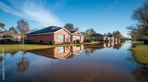 flooding, residential, area, house, water, neighbourhood, reflections, blue, sky, weather, nature, disaster, standing, suburban, outdoors, landscape, after, rain, environment, community, tree, grass, home, roof, emergency, response, impact, local, condition, storm, climate, natural, life, level, damage, calmness, daylight, clear, view, bright