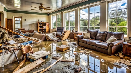 Flooding causes severe water damage to a residential home, with destroyed furniture, debris scattered everywhere, and torn drywall, highlighting the devastating aftermath of natural disaster.