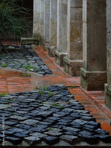 Floor with Cobblestones and stone pillars in the old city center of the city of Narbonne. France.