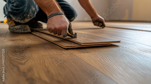 Flooring installer preparing the floor for laminate installation. Featuring precision and detail