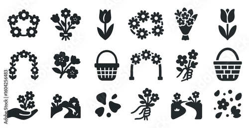 Floral and garden silhouette icons set – line, outline, botanical design elements