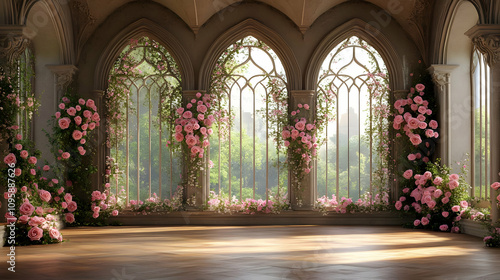 building, home, wooden floor, illustration, calm, rose, manor, nature, background, inspiration, romanticism, romantic, design, graphic, castle, bungalow, vintage, floral, green, dreamy, archway, classic, stone wall, beauty, enchanted, flower, magical, wallpaper, house, serenity, window, pink, digital artwork, palace, room, sunlight, elegant, peace, fantasy, decor, whimsical, fairy tale, aesthetic, interior, art, garden, light