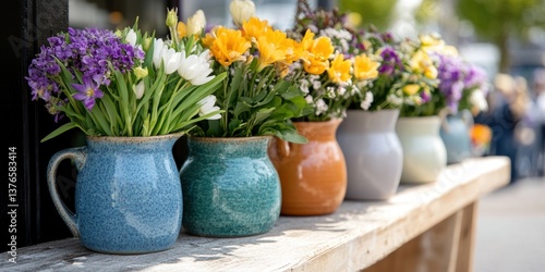 floral arrangement, fresh spring flowers in traditional dutch ceramic vases, set against a blurred bloemencorso parade in the distance