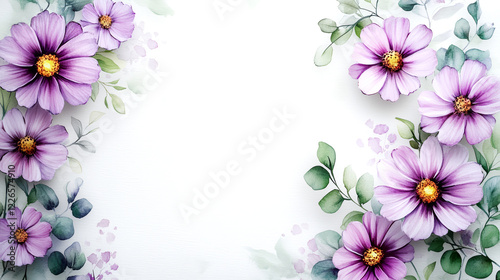 Floral background with cosmos flowers and eucalyptus leaves, copy space