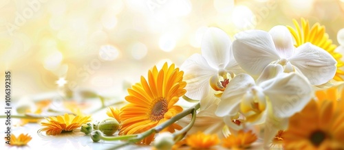 floral, background, orchid, calendula, vibrant, colourful, botanical, decorative, seamless, aesthetic, nature, spring, summer, elegant, fresh, arrangement, flower petals, leaf, textured, lush, artistic, design, wallpaper, banner, versatile, trendy, contemporary, no people