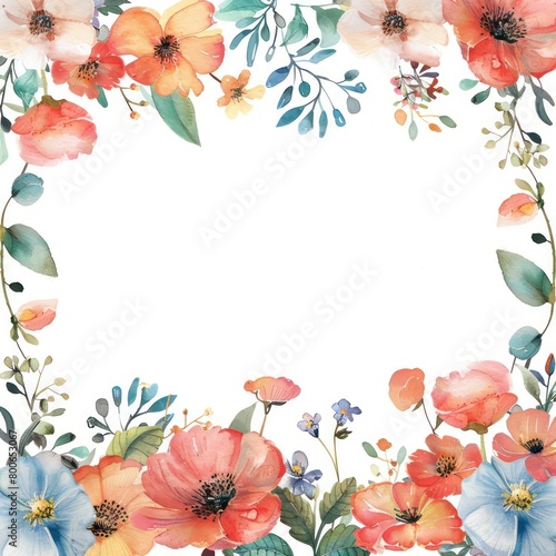 floral border, delicate watercolor flowers, spring colors, wildflowers, white space in the middle