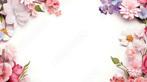 Floral border frame card template. multicolor flowers, leaves, for banner, wedding card. Springtime composition with copy-space, Generative AI illustration