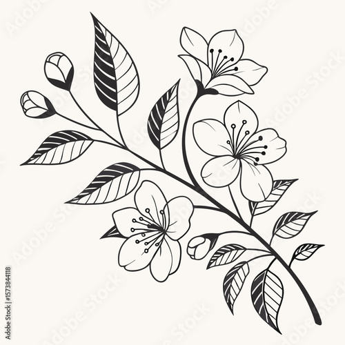 flower, tree branch, leaf, bud, black-and-white, illustration, graphic design, line art, floral pattern, spring, nature, decorative, vector, ornament, isolated, plant, blossom, floral, pattern, design, elegant, simple, art