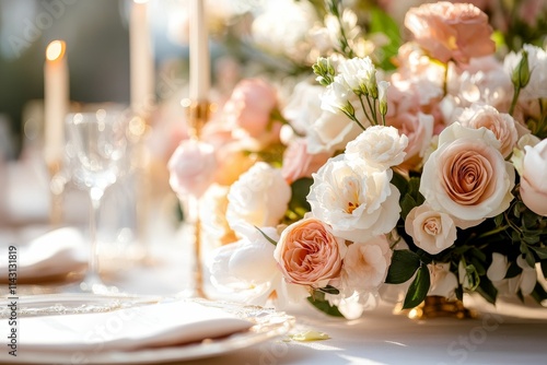 floral arrangement, rose, peach, white, flower, centrepiece, table setting, elegance, romantic, wedding, event, celebration, decor, sunlight, natural light, tablecloth, glassware, plate, napkin, candlelight, soft, delicate, beautiful, pastel, lush, bloom, flower petals, bouquet, greenery