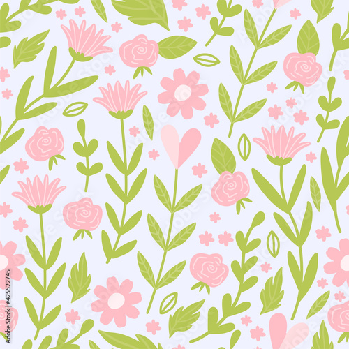 Floral elegant seamless pattern with simple flower and leaves. Vector design for fabric, wrapping paper, packaging, wallpaper etc.