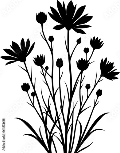 floral, flower, wildflower, silhouette, black-and-white, botanical, nature, garden, spring, bloom, flower petals, stem, leaf, illustration, artwork, decorative, natural, elegant, vintage, minimalist, foliage, flora, plant, artistic, hand-drawn, field flowers, rustic, organic, detailed, monochrome, floral pattern, meadow, bouquet, romantic, simple, stylised, serene