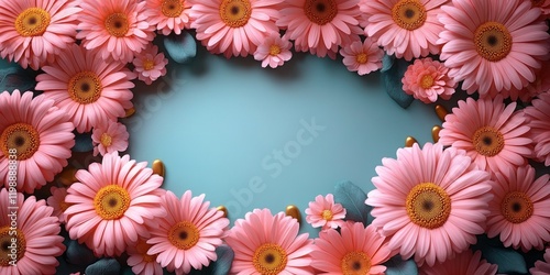 Floral Frame: Pink Gerbera Daisies and Gold Accents on Teal Background