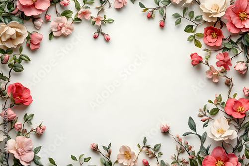 Floral frame, spring blooms, white backdrop, blank space, greeting card