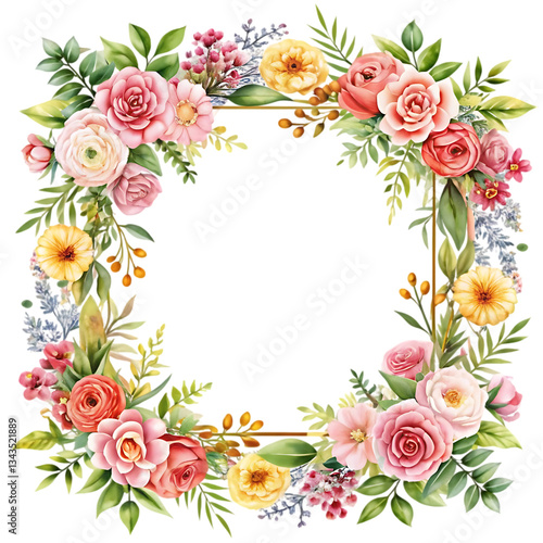 watercolor, rose, flower, floral, frame, border, wedding, invitation, bouquet, pink rose, yellow flower, green leaf, floral pattern, wedding invitation, greeting card, spring flower, summer flowers, floral arrangement, romantic, elegant, floral background