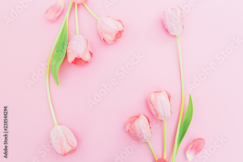 Floral frame with tulips flowers on pink background. Flat lay, top view. Spring time background with copy space