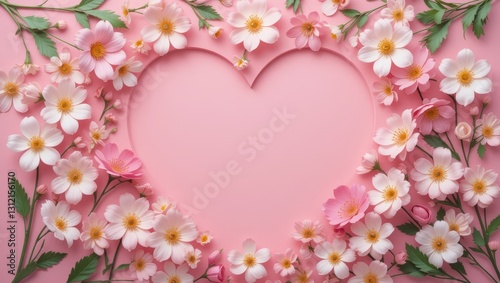 Floral Heart Shape Created with Pink Cherry Blossom Flowers on Soft Pink Background