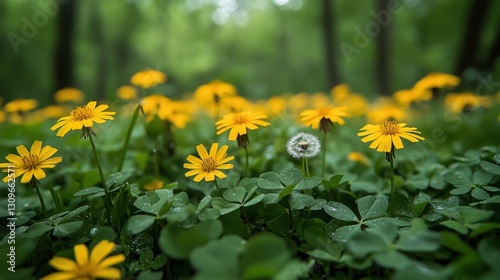 Floral Oasis in the Woods: A vibrant tapestry of yellow wildflowers blankets a forest floor, their sunny faces turned towards the sunlight.