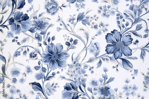 Floral pattern featuring blue flowers and foliage on a white background. The composition is dense and detailed with varying flower sizes.