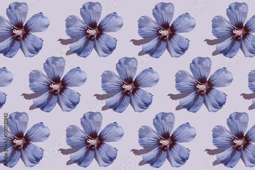 Floral pattern made of beautiful blue hibiscus flowers on pastel background. Minimal style. Nature concept.