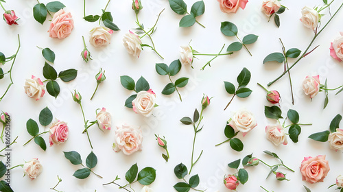 Floral pattern made of pink and beige roses green leaves branches on white background Flat lay top view Valentines background Floral pattern Pattern of flowers Flowers pattern texture : Generative AI