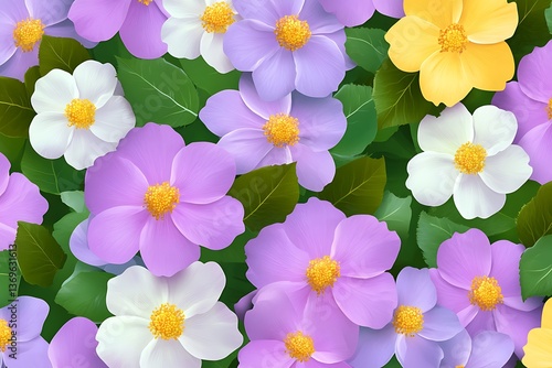 Floral Pattern with Lavender, White, and Yellow Flowers and Green Leaves Seamless Backdrop