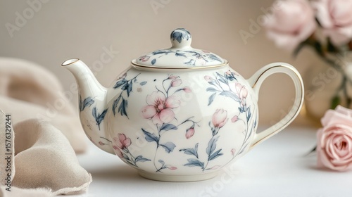 teapot, porcelain, floral, pink, white, blue, elegant, ceramic, kitchen, tea, round, covered, crockery, decorative, classic, gentle, delicate, beautiful, pretty, charming, vintage, stylish, tableware, utensil, object, still, life, soft, pastel, flower, pinkish, grayish, light, beige, fabric, rose, background, studio, image, detail, closeup