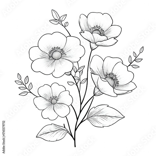 Floral Serenity: Delicate blossoms unfurl in a captivating display of natural beauty, meticulously rendered in a timeless sketch. Their petals and leaves are carefully detailed.