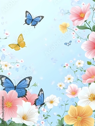 Floral Symphony with Butterflies on a Light Blue Canvas of Springtime Serenity
