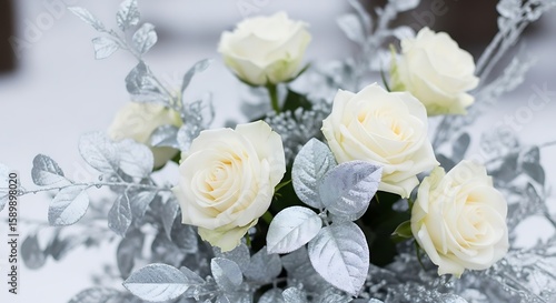 rose, silver, leaf, winter, floral, cheer, festivity, ornament, seasonal, festive, elegance, bloom, elegant, shot, metallic, foliage, year, winterly, life, still, new, arrangement, white, holiday, flower, decorative, decor, celebration, flower, beauty, flora, decoration, christmas, nature, season, beautiful, closeup