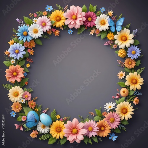 flower, daisy, blooming, flowering, leaf, green, foliage, chaplet, circular, frame, circle, butterfly, blue, egg, easter, spring, greeting, colourful, arrangement, decoration, floral, garden, decorative, nature, artwork, design, element, copy space, studio shot, still life, ornate, holiday, celebration, blossom, botanical, artistic, symbol, rendering