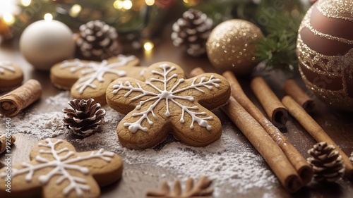 Flour-dusted table filled with gingerbread cookies, cinnamon sticks, and holiday decorations, Christmas baking details, cozy festive setup