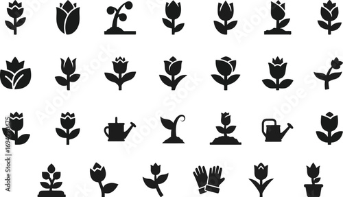 flower, plant, rose, gardening, bloom, nature, pot, watering, grow, green, dirtied, seed, garden, germinating, tool, leaf, growth, blossom, bud, floral, greenhouse, care, spring, icon, vector, silhouette, set, symbol, illustration, pattern, butterfly, design, tree, black, icon, decoration, element, bird, insect, animal, food, collection