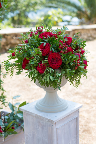 chrysanthemum, carnation, fern, hydrangea, flower, arrangement, decor, table, rose, white, celebration, wedding, beautiful, vase, bowl, design, leaf, floral, outside, old, texture, posh, composition, outdoors, antique, vintage, style, bouquet, event, banquet, green, elegance, romance, red, eatery, romantic, flowerpot, bollard