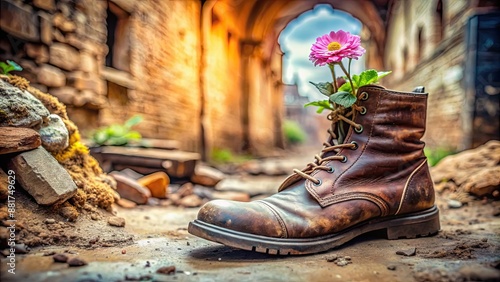 Flower blooming in an old boot amidst ruins, persistence, life, resilience, growth, nature, beauty, aging, decay