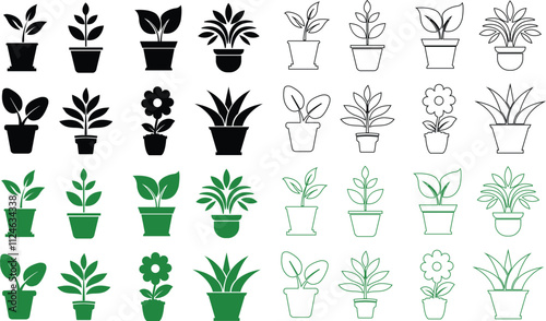 Flower plant pot flat and line icon set. Home plant leaf gardening symbol black and green vector collection isolated on transparent background. Plant garden floral growth nature sign Pictogram for web