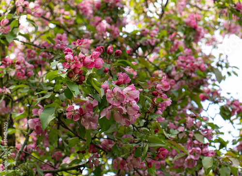 flowering apple tree with pink flowers in the park in spring.