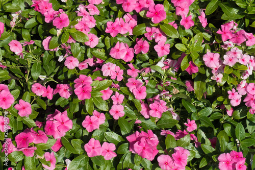 Flowering pink Catharanthus roseus in the garden in July