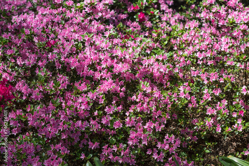 Flowering purple pink color rhododendrons in springtime or summer in botanical garden, vivid color rhododendrons on sunny day outdoors, floral background
