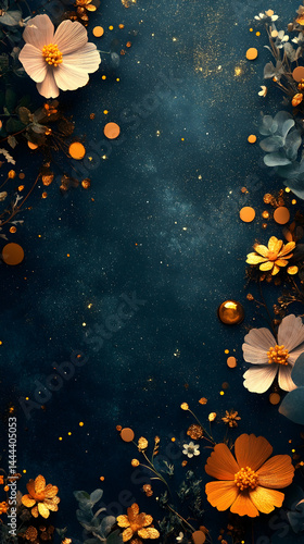 Flowers and gold orbs adorn a dark blue speckled background creating a vibrant and textured floral design