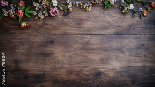 flowers and scattered petals on old rustic wooden table texture, top view copy space