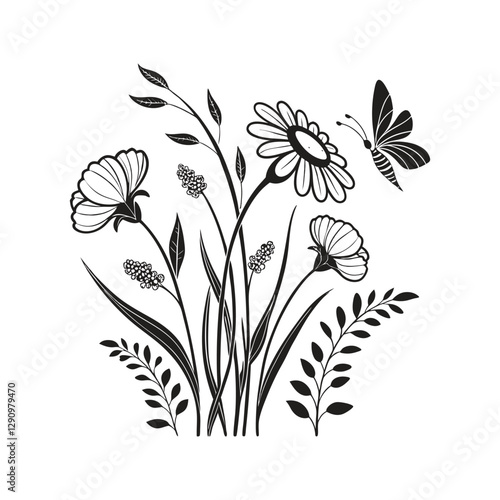 flower, illustration, leaf, nature, vector, art, design, floral, drawing, black, symbol, plant, ornament, silhouette, arabesque, abstract, collection, element, set, sunflower, decoration, icon, summer, graphic, isolated, tulip, white, botany, flora, pattern, signs, beautiful, spring, group, minimal, horticulture, florist, shape, vintage, decorative, logotype, daisy, wallpaper, decor, bloom, natural, lawn, tribal