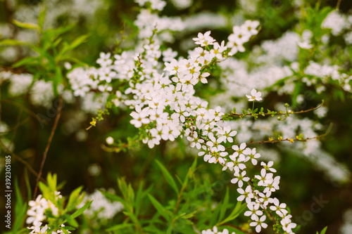 Flowers in the garden. Beautiful white flowers. Blooming white flowers of spirea. Close-up of garden bush flowers- spiraea flower. Spiraea flower background. Macro shot.