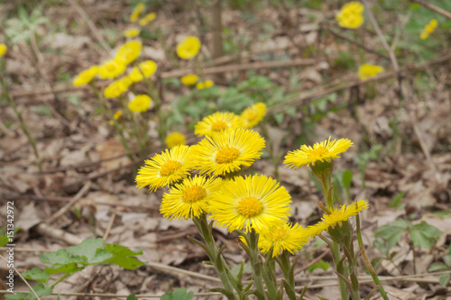 flowers of coltsfoot on leafless stalk. Yellow spring primroses