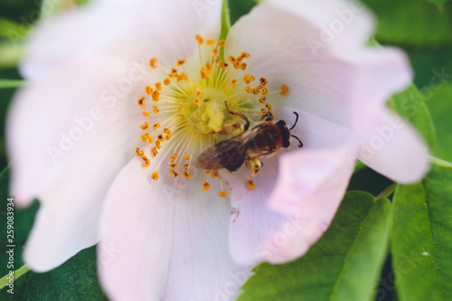 Flowers of dog-rose rosehip growing with bee in nature green background