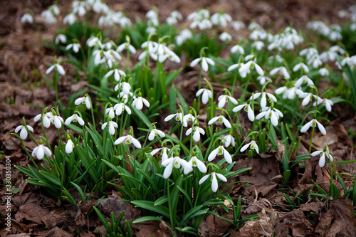 Flowers snowdrops. First beautiful snowdrops in spring. Common snowdrop blooming. Galanthus nivalis bloom in spring forest. White tender flower primrose.