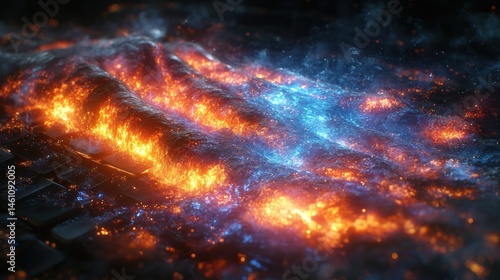 abstract, particle, orange, blue, digital, landscape, surface, flow, texture, motion, vibrant, energy, background, design, graphic, wallpaper, computer, art, creative, pattern, light, dark, futuristic, science, technology, modern, wave, dynamic, element, plasma, render, effect, spark, fire, water, liquid, chaos, evolution, datum, information, cloud, network, communication, cyberspace, connection, speed, future, innovation