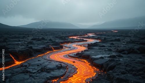 Flowing Lava Stream on Dark Volcanic Landscape with Smoky Horizon