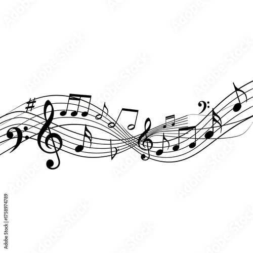 music, note, melody, sound, rythm, harmony, song, staff, wave, musical, art, vector, symbol, design, composition, pattern, line, black, white, minimal, abstract, artistic, audio, sheet, note, concert, performance, band, creative, tone, decor, graphic, flowing, instrument, acoustic, treble